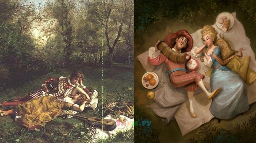 И полотно бельгийского живописца Огюста Серре «Пикник». Обе эти картины, вероятно, добавлены художниками Disney в мультфильм для того, чтобы добавить романтичности всему происходящему.