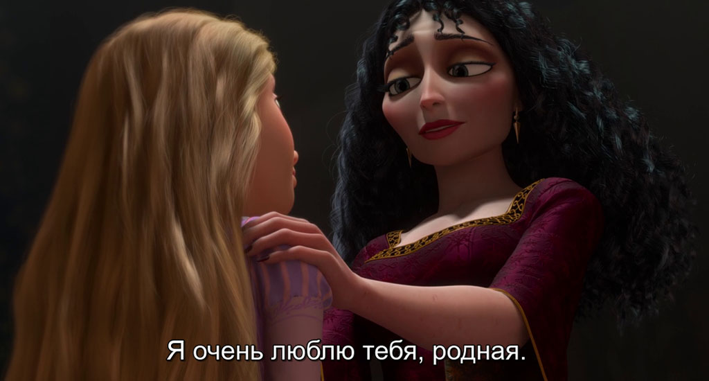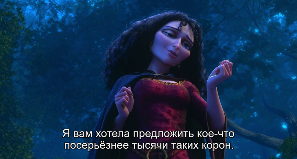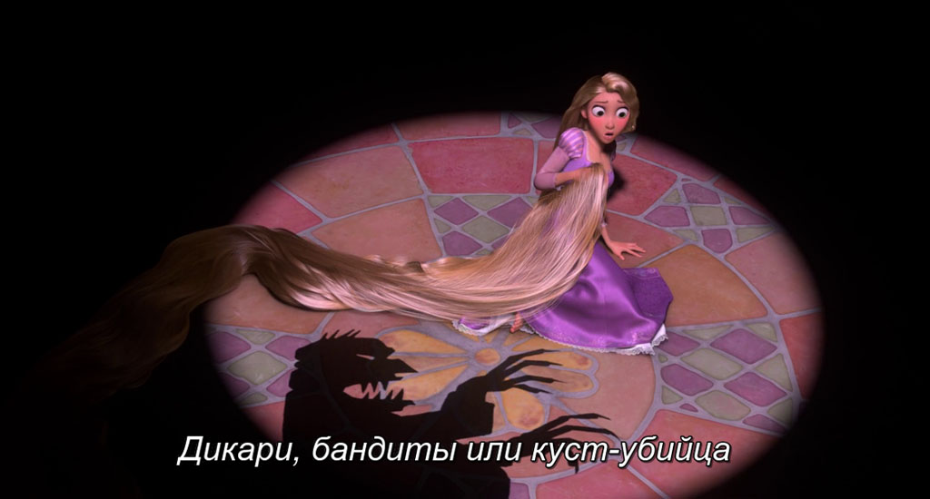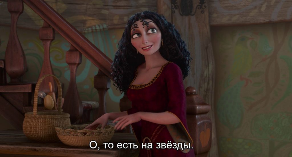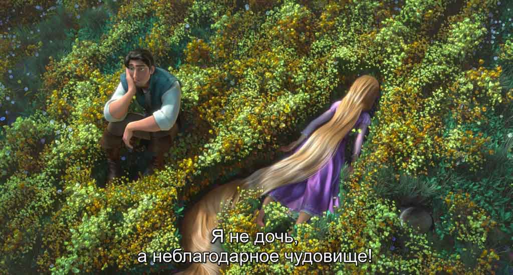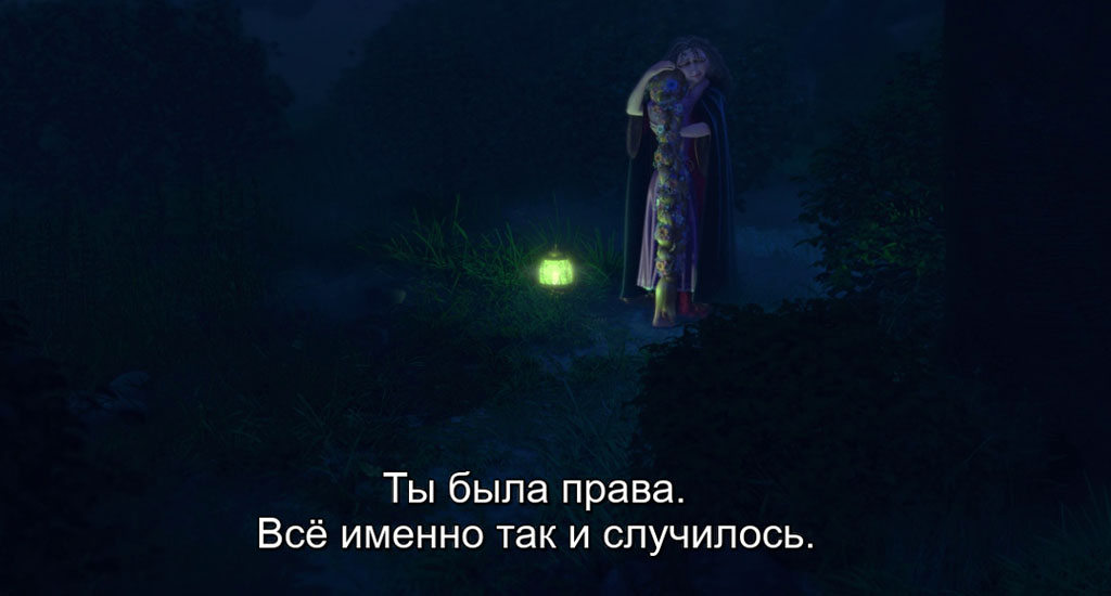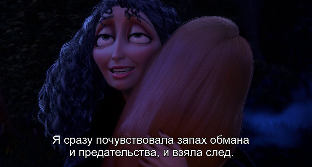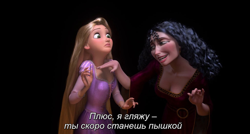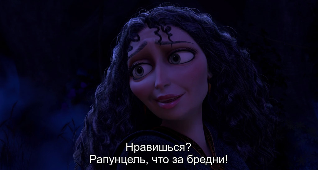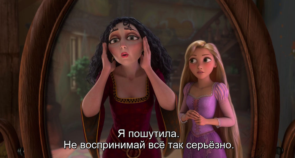 Пример: в сцене, когда Готель навещает Рапунцель, она говорит про себя, как про юную и красивую девушку, вызывая у принцессы недоумение. И мгновенно переводит всё в шутку. Время посмеяться, да только не хочется, даже Рапунцель.