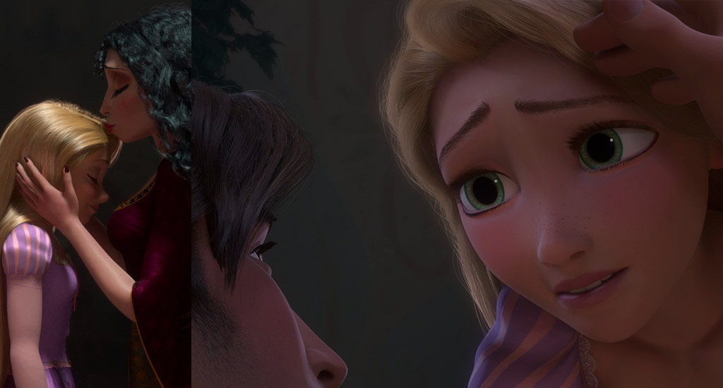 Обратите внимание на то, как Готель относится к волосам Рапунцель — вечно целует их, гладит и подпитывается от них. В то время как Юджин старается убрать эту помеху от лица принцессы, а в решающий момент и вовсе режет их, зная, что они могут его излечить. Юджину важно, чтобы Рапунцель была спасена от Готель, даже если он и сам погибнет.