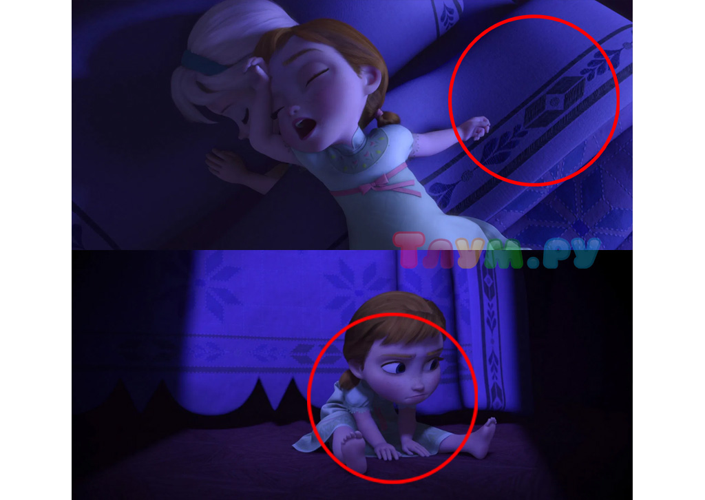 Анна зовёт сестрёнку играть посреди ночи, но Эльза не слишком довольна тем, что её разбудили, да ещё и зовут куда-то. Поэтому она спихивает девочку, и та падает с кровати — но на предыдущих кадрах отлично видно, что на кровати ещё много места.