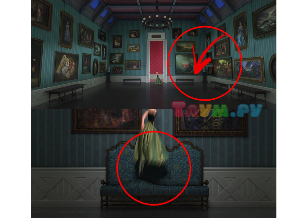 Когда Анна резвится среди картин, она запрыгивает на диван (Серьёзно, что это за пружины там такие? Мы до сих пор удивляемся!), но на другом кадре этого дивана там уже нет. Да в этой комнате вообще нет ни одного дивана!