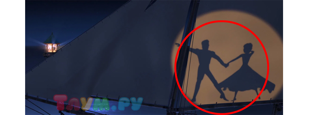 Когда Анна и Ханс танцуют, они забираются на лодку с парусом — и их тени виднеются сквозь ткань. Вот только тени отбрасывают только они, а пола, на котором они танцуют, не видно. Видимо, пара освоила магию воздуха и теперь может спокойно летать и танцевать одновременно.