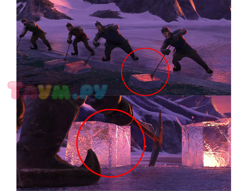Опять лёд — он, кажется, будет занимать почётное место в нашей подборке ляпов. Так как в Эренделле многое зависит от льда, добывают его практически в промышленных масштабах. Вот только инструменты для добычи не слишком крепкие — посмотрите на них, а затем посмотрите на толщину льда. Да, лёд на коне…