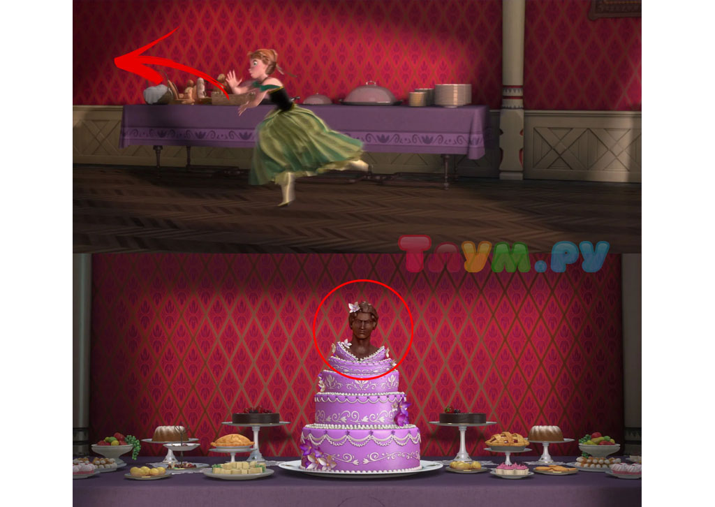 Когда Анна танцует с медным бюстом, она кружится, и тот вылетает у неё из рук и приземляется прямиком на верхушку торта. Но по законам физики он никак не мог упасть именно так: вертикально, увенчивая собой кондитерское изделие.