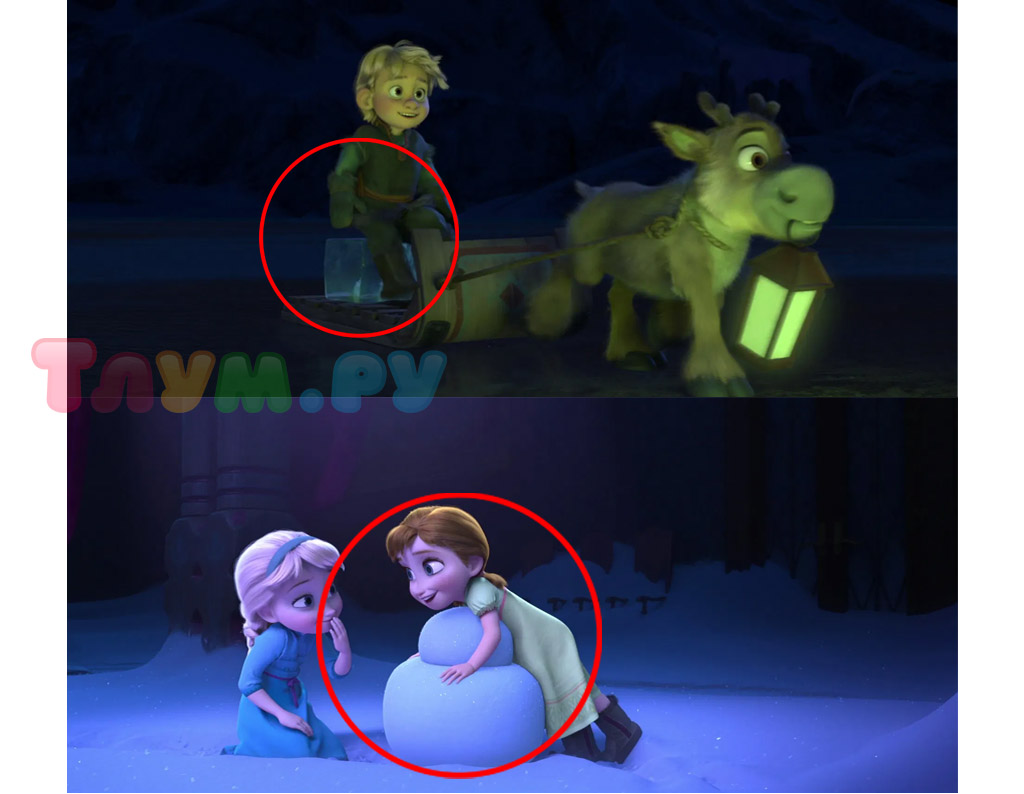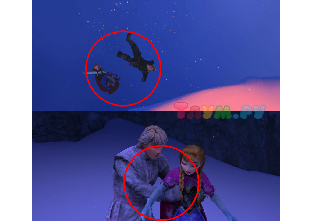 Когда Анна и Кристофф падают из лап ледяного великана, созданного Эльзой, можно увидеть, что они связаны друг с другом при помощи верёвки. Но когда герои выбираются из сугроба, никакой верёвки на них нет. Не могла же она просто взять и исчезнуть! Ах да, это же мультфильм. Могла.