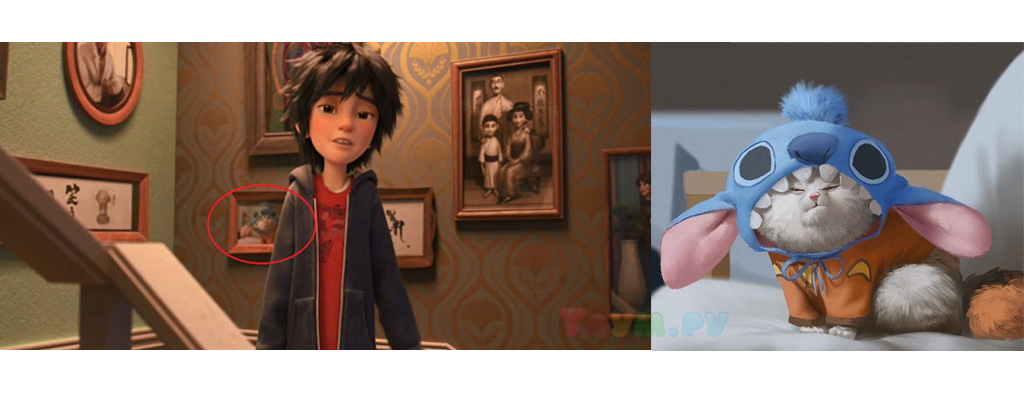 В мультфильме «Город Героев» можно увидеть забавную отсылку — в доме тёти Кэсс в Сан-Франсокио висит множество картин и фотографий. И вот на одной из них мы заметили её кота Мотти с вредным выражением мордочки и в костюме Стича из мультфильма «Лило и Стич».