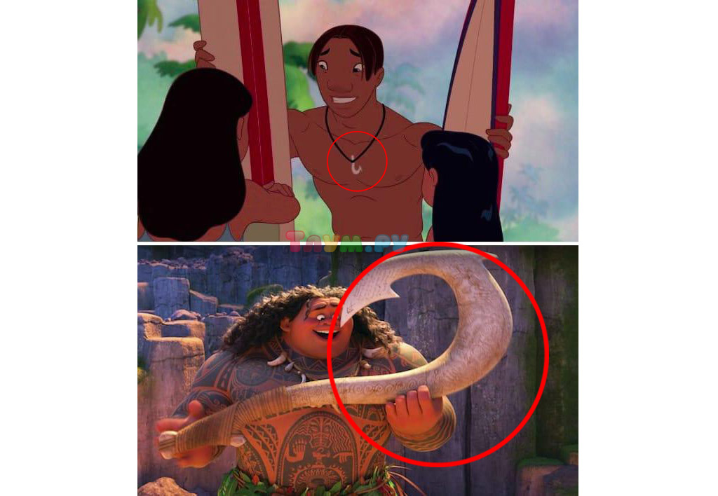 А в самом же «Лило и Стиче» на шее Дэвида можно увидеть необычное украшение — костяной крюк. Точно такой же крюк занимает большое место в сюжете мультфильма «Моана», который вышел спустя 14 лет после премьеры мультика про очаровательного инопланетянина!