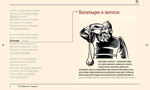 Перед нами интересно оформленная бессмертная поэма Михаила Юрьевича Лермонтова о подвиге русских солдат. В левой половине экрана располагается текст с подчеркнутыми трудными местами, которые требуют пояснений для современных детей. А в правой открываются сноски с пояснениями и картинками, что такое кивер и булат, редут и мусью, а также даются исторические правки. Прекрасно подойдет школьникам, которые проходят это произведение в школьной программе.