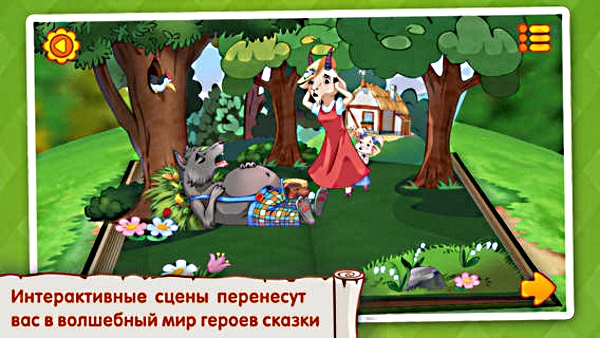 Классическая сказка, оформленная в стиле «Аркадия Паровозова», когда герои и декорации выполнены как из картона и одна за другой возникают на сцене. Все персонажи тут анимированы, а последовательность некоторых действий маленькие читатели смогут выбрать самостоятельно. Историю ребенок сможет прочитать сам или же ему расскажут сказку профессиональные актеры. Стоит отметить, что полная версия книги является платной.