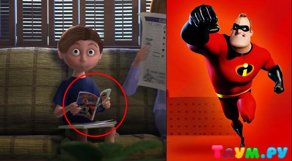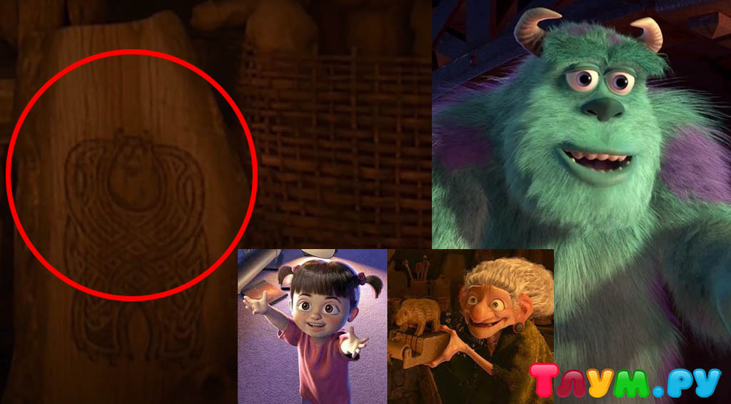 Когда Мерида из «Храброй сердцем» заходит в хижину ведьмы, можно увидеть изображение Салли из «Корпорации монстров». У фанатов даже появилась интересная теория о том, что этой ведьмой вполне может оказаться и Бу, которая в поисках своего большого друга прошла через одну из дверей и оказалась в прошлом. Ведь все мультфильмы студии Pixar связаны, помните?