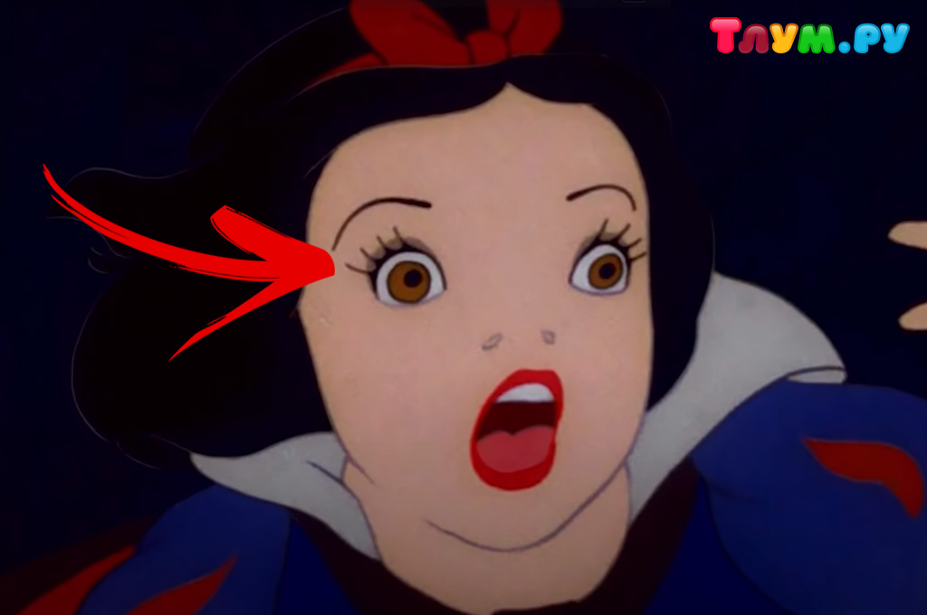 Ну очень пугающий момент, который очень трудно увидеть при обычном просмотре — когда Белоснежка бежит по лесу, от страха её глаза начинают смотреть в разные стороны. Такой любопытный и забавный факт могут заметить только внимательные зрители.