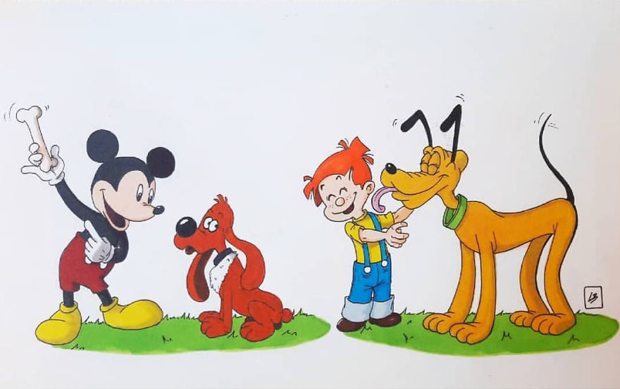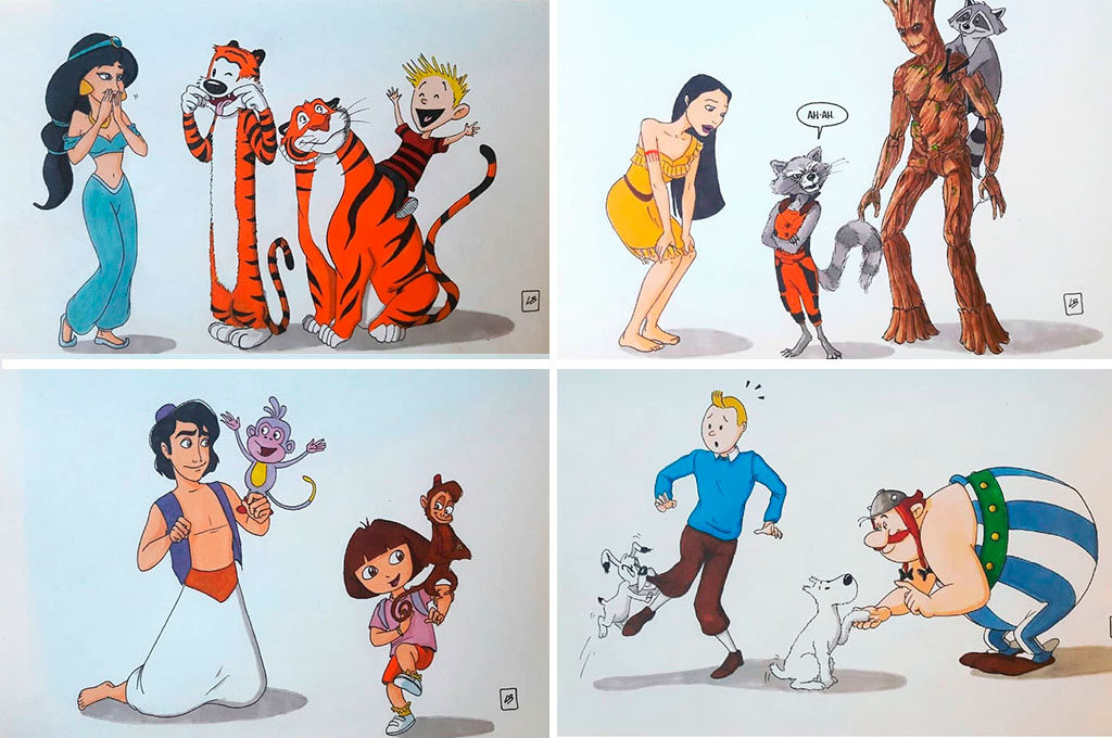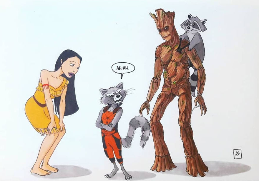 Художница из Франции Линда Будебала подумала об этом и опубликовала в своем [данные удалены] иллюстрации на тему обмена питомцами. Смотрим и удивляемся тому, как же мы раньше не думали, насколько круто будет смотреться Покахонтас и Ракета вместе!