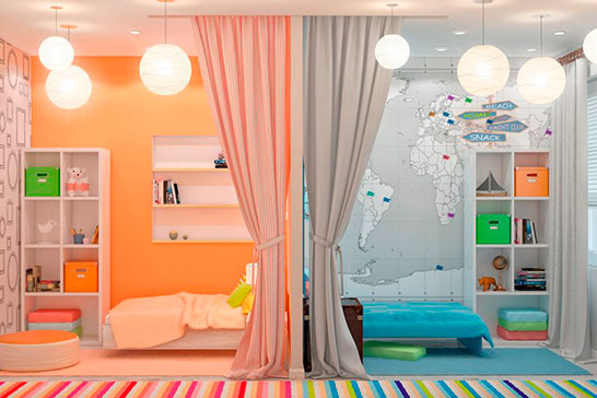 Чтобы провести границу между Васиным и Петиным (или Васиным и Машиным) можно использовать несколько уловок. Самая простая — ширма или штора, которая визуально разделит комнату на две части. Части должны быть примерно равноценными, но помните, что старшему нужна «рабочая зона» с письменным столом, которая занимает довольно большую площадь. А младшему места под игрушки всегда будет не хватать. Да и потом он вырастет и ему нужен будет свой стол. Еще в качестве разделителя может выступить стеллаж или шкаф, раздвижная дверь, арка или передвижная мебель.