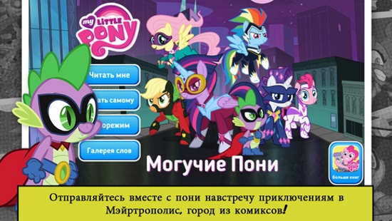 Интерактивная книга перенесет ваших маленьких читателей в мир приключений. Как это произошло со Спайком: он попал в свою любимую книгу комиксов вместе с маленькими пони. Спайк станет их верным помощником и поможет обрести суперспособности. Ведь скоро суперпони предстоит битва с коварным злодеем в самом сердце Маретрополиса! Детей ждет интерактивный рассказ о приключениях отважных пони, который можно послушать, а можно прочитать самостоятельно. Также в приложении есть раздел «Избранные слова» для практики английского.