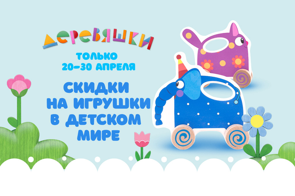 Детский Мир предлагает своим покупателям устроить настоящий деревянный праздник, не выходя из дома. С 20 по 30 апреля делайте заказ игрушек по мультсериалу «Деревяшки» со скидками от 30%! В ассортименте вы найдёте каталки, фигурки, музыкальные игрушки, мягкие и очень плюшевые игрушки и даже раскраски.