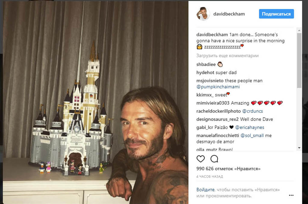 В социальной сети Instagram один из самых узнаваемых людей в мире спорта — Дэвид Бекхэм — выложил очень трогательную фотографию. На ней он сидит рядом с огромным диснеевским замком из конструктора LEGO. Подпись под фото гласит: «Утром кого-то ждет милый сюрприз». Кого-то — это его шестилетнюю дочку Харпер, конечно.