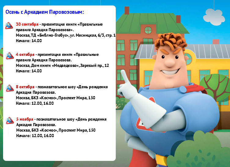Книга — это одна сторона проекта «Аркадий Паровозов». Точнее вторая, после мультфильма. А есть еще очень важная для нас третья сторона — это театрализованное шоу «День рождения Аркадия Паровозова». И поэтому мы с огромным удовольствием хотим пригласить наших поклонников на театрализованное шоу, которое будет в октябре и в ноябре в Москве и других городах.