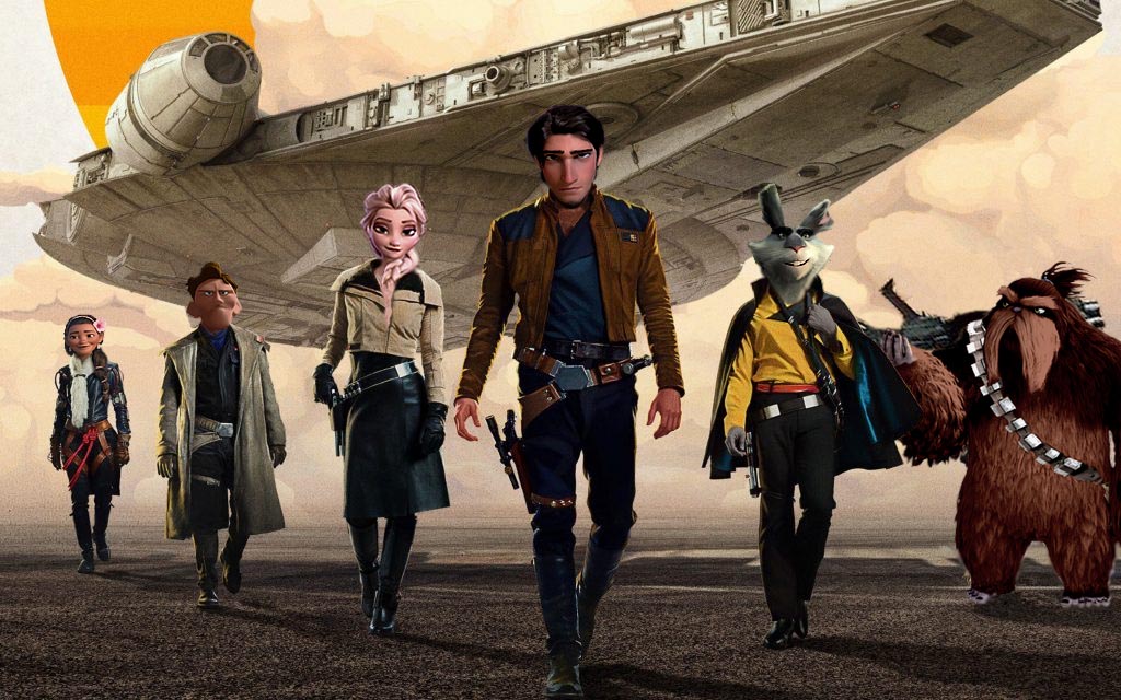 Слева направо: Сина («Моана») — Вэл, Чарльз Манц («Вверх») — Тобиас Беккет, Эльза («Холодное сердце») — Кира, Флинн Райдер («Рапунцель») — Хан Соло, Пасхальный кролик («Хранители снов») — Лэндо Калриссиан, Йети (оттуда же) — Чубакка. Это всё «Звёздные войны», а точнее фильм «Хан Соло».