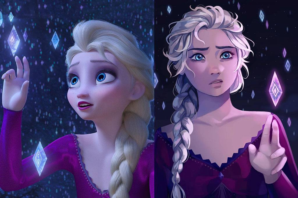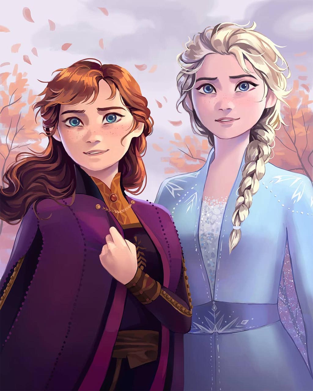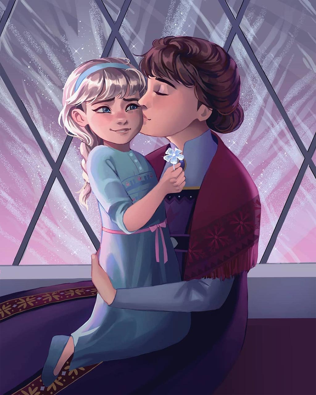 Художница Хезел Лейн под ником tadpole_art создала целую серий рисунков Эльзы, Анны и Нокка в своём стиле. Посмотрите, как здорово у неё получилось перерисовать кадры из мультфильма.