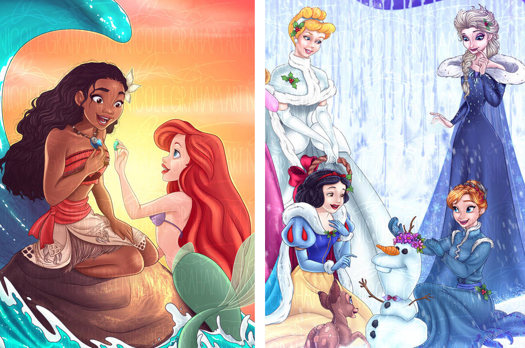 Миры принцесс Disney представляют из себя так называемое непаханое поле. Из возможностей. Какие бы героини могли в самом деле встретиться, подружились ли бы они? Узнать это наверняка позволила себе Николь Грэхем, художница из Великобритании. Она не только удачно вписала персонажей из разных сказок в миры друг друга, но и показала, что они бы отлично поладили между собой. Вот уж кто-кто, а принцесса точно поймёт тягости жизни другой принцессы, не так ли?