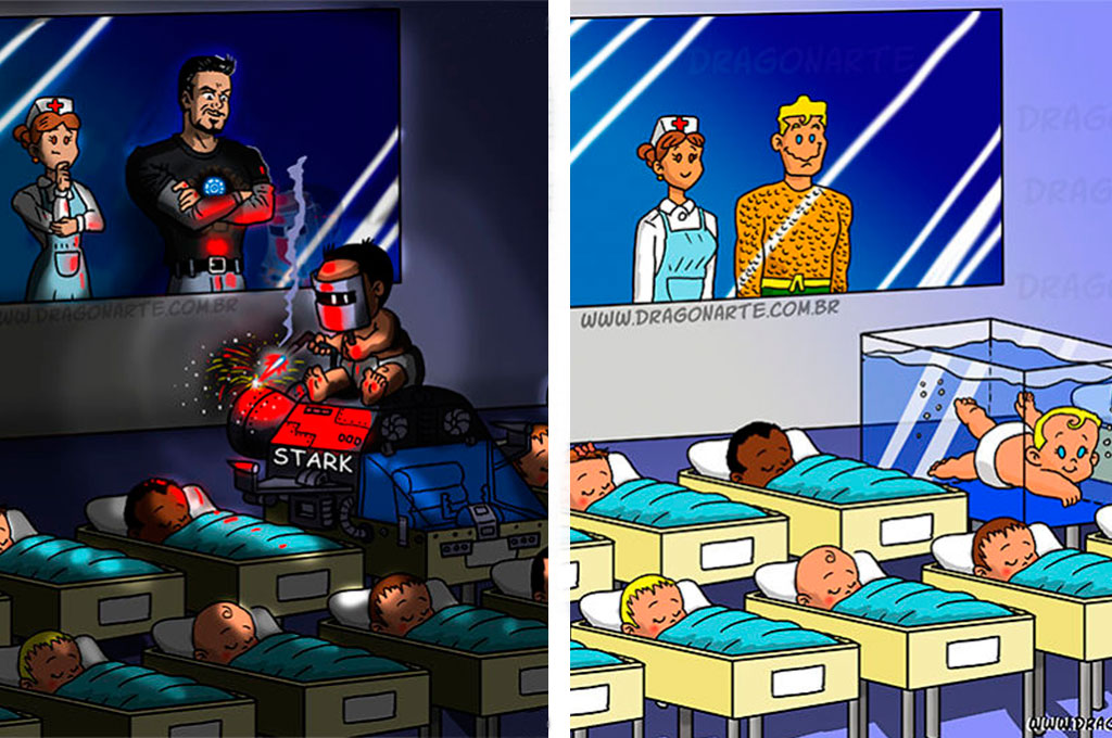 Первая встреча новоиспечённых отцов со своими детьми — это очень мило. И очень забавно, если родители новорождённых — это супергерои и другие известные персонажи, а дети — ну прямо вылитые папы! Такие иллюстрации нарисовал бразильский художник Лукас Эдуардо Насименто, известный как Dragonarte.