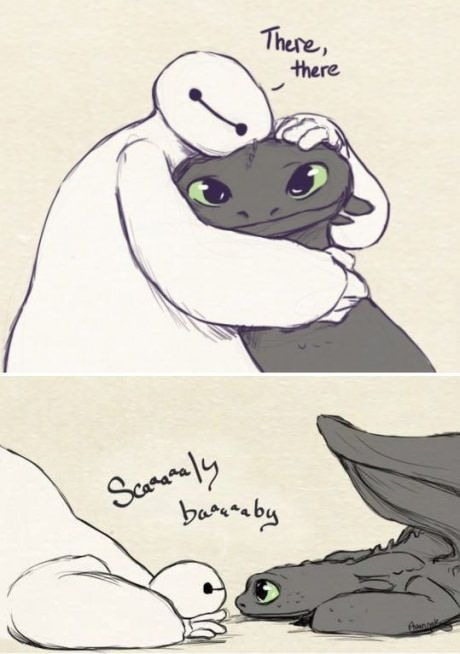Завершаем удивительную подборку добрыми обнимашками в исполнении Беймакса и Беззубика.