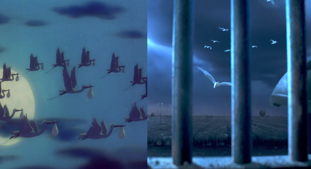Лучшие почтовые птицы из сказок пролетели и в ремейке. Сделали они это, конечно, с пустыми клювами, никаких кульков с детёнышами животных не было. Но сам символ того, что Дамбо появился у своей мамы в эту ночь, не может остаться незамеченным.