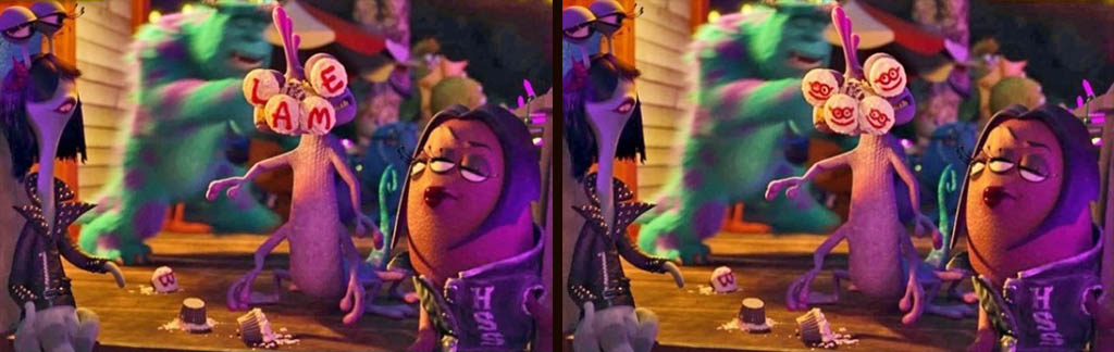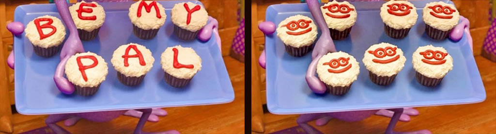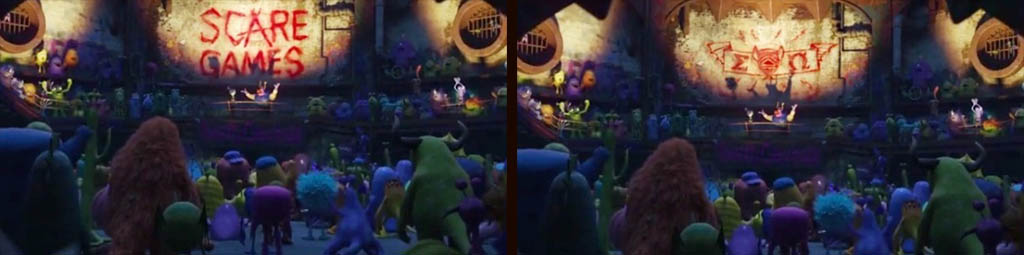 Чаще всего студии заранее готовят кадры именно с переведёнными надписями на различные языки. Но иногда случается что-то более интересное. Например, в «Университете Монстров» надпись «Be my pal» («будь моим другом») на пироженках заменили на смайлики — они понятны любому.