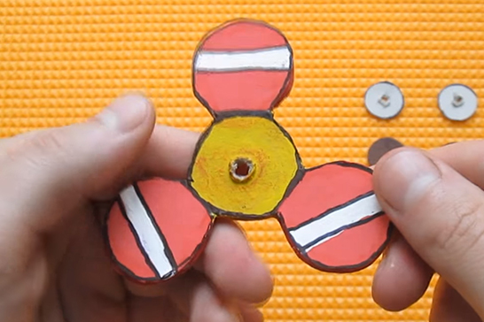 - Приклейте два оставшихся маленьких кружка поверх концов стержня. Готово! Спиннер из картона, без подшипника и с полным разлетом фантазии в плане дизайна обязательно займет ребенка на какое-то время.
