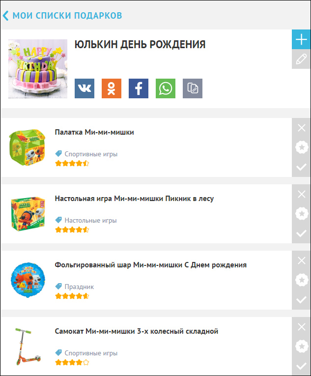 3. Внутрь каждого списка можно добавлять желаемые товары. Например, Юля — фанатка «Ми-ми-мишек», и День рождения вы хотите отметить в стиле мультфильма: украсить все фирменными шариками, и чтобы все родственники подарили Юле подарки с героями мультика — самокат, палатку и настольную игру.