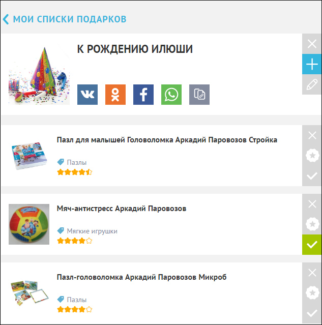 5. Каждый, кто видит список, может забронировать за собой тот или иной подарок, чтобы избежать двух одинаковых игрушек. Для этого надо всего лишь нажать на иконку со звездой, и все участники списка увидят: ага, пазл с Паровозовым уже занят, надо дарить что-то другое. А если вы уже купили подарок, не дождавшись праздника, просто нажмите около товара галочку — купили, у нас это уже есть. Мяч дарить не надо!