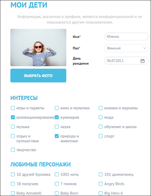 1. Заполните профиль ребенка в разделе «Мои дети». Укажите, сколько ему лет, чем он увлекается и какие у него любимые мультфильмы. После этого вам будут автоматически предложены товары, подходящие вашему малышу.