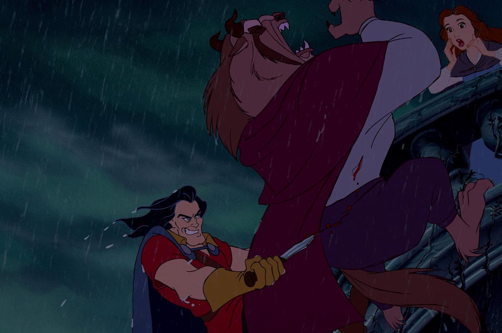 Вот уж точно не наивное дитя. Наказан за эгоистичный нрав, равнодушие и чёрствость. Для него битва в облике зверя — обычные дело. Однако драться не из-за злобы и агрессии, а в защиту кого-то, вот это оказывается не так-то и просто… Но по-другому поступить уже невозможно. Сначала битва за Белль с волками, потом с Гастоном в замке. Вдруг ему становится всё равно, кто сильнее и кто прав. В нём открываются такие грани души, которые усмиряют его бессильную злобу и открывают для него любовь. Принять, простить, отпустить — вот чему учит его битва.