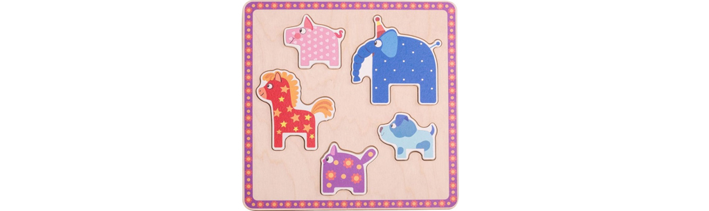 Слон Ду-Ду, лошадка Иго-Го, поросёнок Хрю, собачка Гав-Гав и кошечка Мяу — у всех них есть домики, как знают маленькие и большие зрители мультсериала «Деревяшки». В пазле домиков, конечно, нет, но есть специальные места, в каждое из которых поместится только та деревяшка, для которой это место сделано. Развивающая игра учит различать размеры предметов.