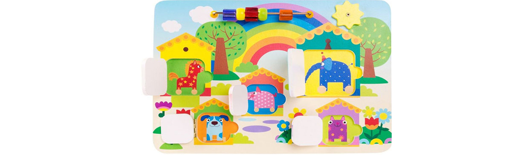 Как мы уже говорили, каждая деревяшка живёт в своём собственном доме. В этом бизиборде нужно как раз-таки правильно угадать, кто же именно скрывается за закрытыми дверями. На доске есть счёты, специально для тех, кто любит путаться. На этом бизиборде можно поиграть даже с солнышком.