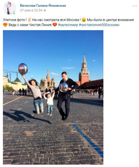 И семья Вячеслава и Галины Янковской. Они сопроводили свою фотографию следующим текстом: «Улетное фото ! На нас смотрела вся Москва ! Мы были в центре внимания. Ведь с нами Чистая Линия».