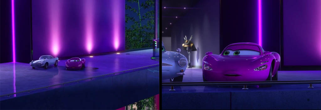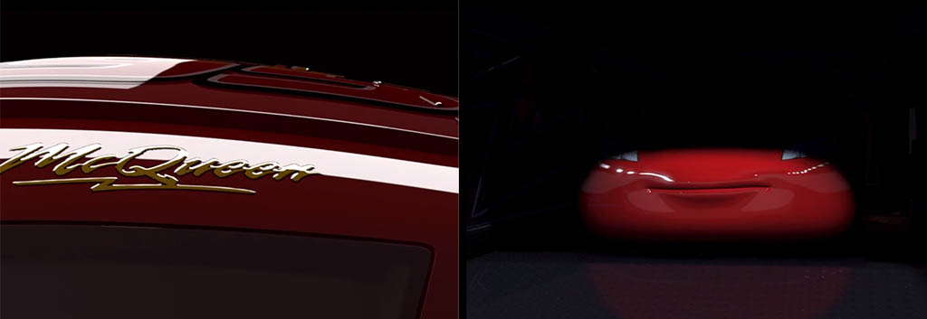 Но это «цветочки». Вот самая знаменитая «ягодка» из первых кадров мультика: глянцево переливающиеся очертания МакКуина, которые каким-то образом сверкают… в темноте. Ведь именно из полной тьмы герой кадром позже и выезжает.