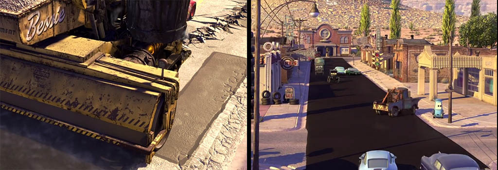 Кстати, здесь будет уместно спросить что-то про Бесси. Единственный «неживой» транспорт, показанный в «Тачках». Кто она? Что она такое? Почему мы видим, что на края дороги свежий асфальт не попадает, но потом она вся оказывается залита им целиком?