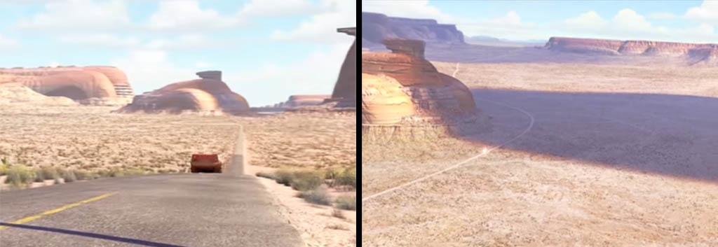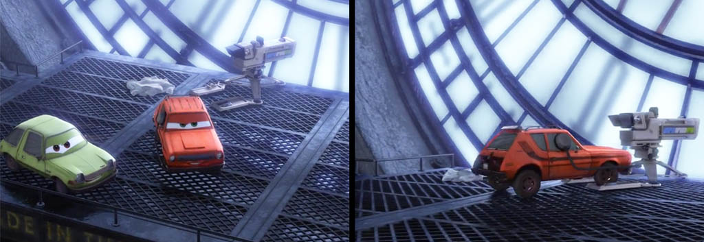 На таких мелочах, как перемещающаяся по столу ваза во время свидания с Салли, мы заострять внимание не будем. Лучше спросим, как в финале первой части Шериф (черный полицейский автомобиль) лихо изменил местоположение в соседних кадрах.