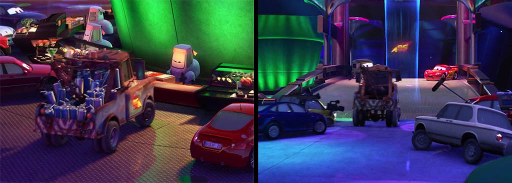 В другой момент из фар шпиона начинают вылетать странные темные продолговатые предметы, но примагничиваются уже светлые. Свою цветовую принадлежность не могут определить и заклепки на Молнии МакКуине. То они темные, то светлые, и так — по кругу. Возможно, виновато и освещение, но контраст все равно резкий.
