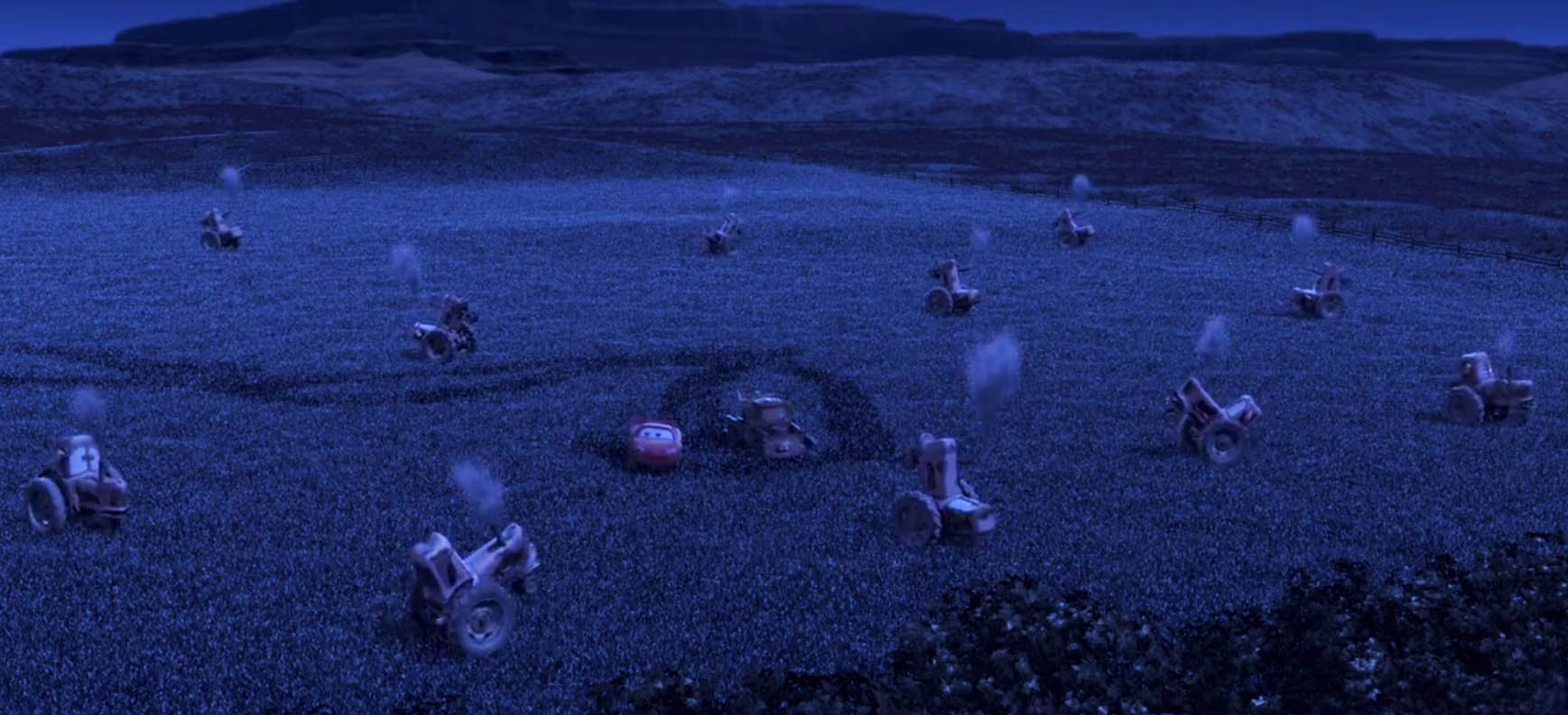 А вот еще забавный момент с тракторами. Мэтр для примера будит двух этих «коров», и они переворачиваются. Но когда за дело принимается Молния и нам показывают общий план сверху, становится видно, что одновременно переворачиваются все тракторы. Те два, что уже задрали мордашки к верху, так быстро успели вернуться? Очень странно. Мы уж не заикаемся о том, что даже в чистом поле комбайн никогда и ни за что не догонит гоночный болид. Старый эвакуатор, кстати, тоже не сможет догнать спортивный автомобиль.