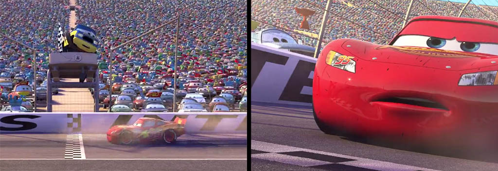 Переходим к нарисованным на асфальте линиям, и тут творится полный хаос — они постоянно перемещаются по отношению к неподвижным в тот момент автомобилям, буквально переползая под колесами туда и обратно. Просто посмотрите, как финишная черта в соседних кадрах подвинулась поближе к Молнии в финале первого мультфильма. Она тоже верила в его победу.