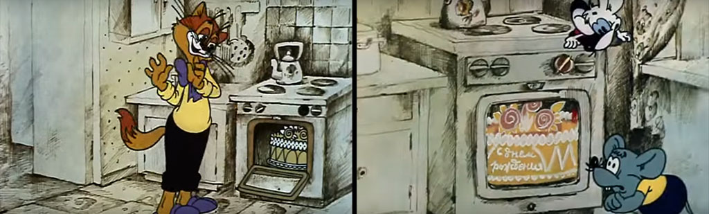 Еще немного о надписях: в эпизоде «Автомобиль кота Леопольда» свое содержание варьирует номерной знак кошачьего транспорта. Впрочем, это совершенно обычное дело. А как насчет надписи, которая то появляется, то исчезает на праздничном торте в процессе готовки? Да и сам торт как-то резко меняет внешний вид. С днем рождения, кот Леопольд!