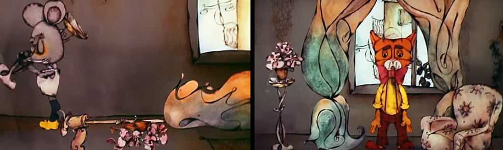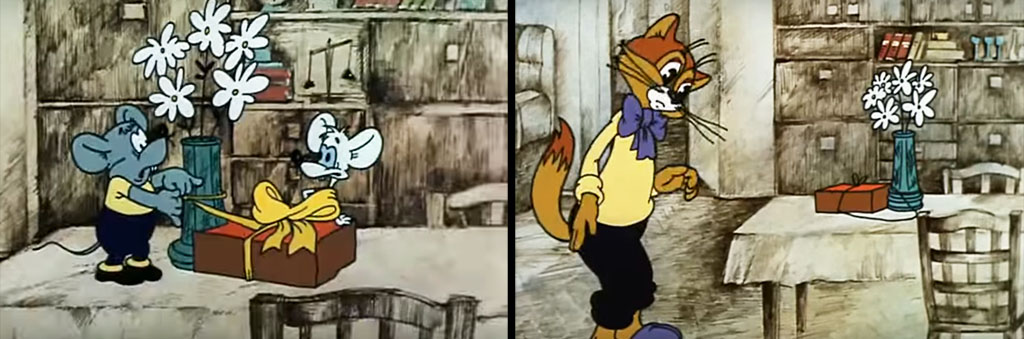 Возвращаемся к превращениям предметов: телевизор из одноименной серии очень переменчив, имеет несколько форм и конфигураций. Вот веревка в «Дне рождении кота Леопольда»: опоясывающая щедрый дар мышей ленточка сначала больше похожа на желтый бант, потом — на тонкую черную веревочку, а потом — на тонкую желтую. Числовые загадки также представлены во всей красе. Сколько ромашек на самом деле в стоит вазе?