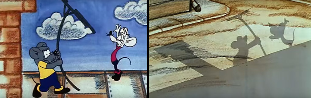 Поговорим о тенях. В серии «Леопольд и золотая рыбка» у белого слона можно заметить сразу три тени от хвоста. Ладно, мы не видим источников света, мало ли, что происходит в данный момент в небе. Но что за странная самостоятельность у тени трубы в «Телевизоре кота Леопольда»? Она имеет более детальный облик, чем сама труба.
