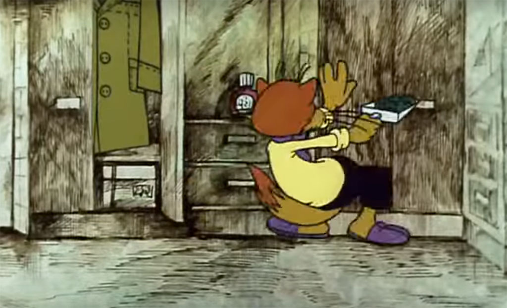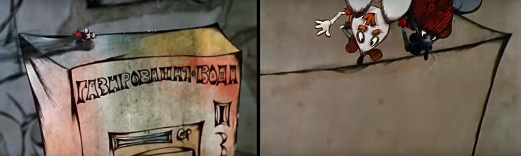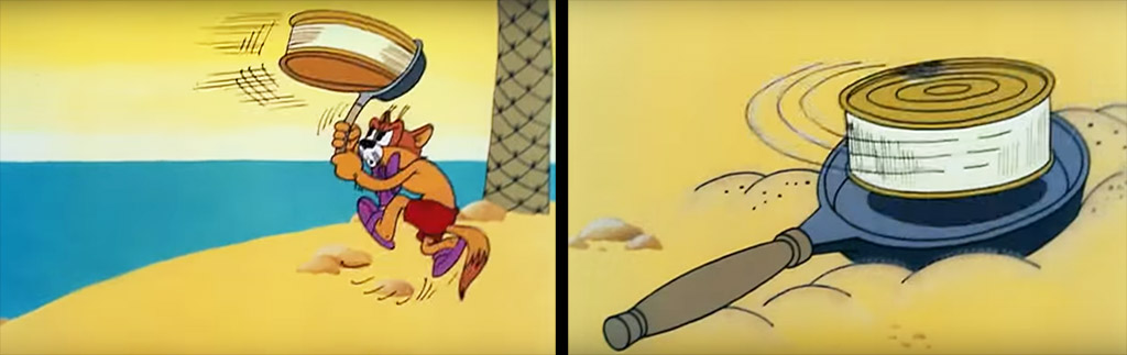 Про меняющее количество створок окно долго говорить не будем, вспомним чудесную бутылку из хитроумного механизма, умеющую менять свое положение в полете (выстреливает горлышком вперед, летит горлышком назад) и перейдем к следующей сцене в «Кот Леопольд во сне и наяву»: здесь есть загадочная сковородка, которая то валяется рядом с грустным котиком, то нет, и банка с внезапно появляющейся и исчезающей надписью «Завтрак туриста». Сама железяка сначала выглядит огромной, потом легко помещается в сковородку. Настоящая консервная магия.