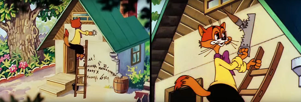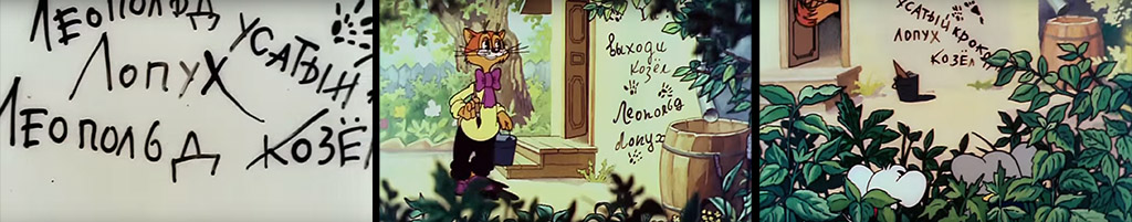 Мы добрались до самого известного ляпа в «Коте Леопольде», причем это не просто какая-то ошибка, а целая сцена, полная абсурда и необъяснимых тайн. Эпизод называется «Лето кота Леопольда», где мышата разрисовывают кошкин дом нехорошими надписями, а Леопольд миролюбиво их замазывает. Первыми бросаются на глаза сами почеркушки — их содержание меняется на протяжении всей сцены. Бедного кота успели назвать и усатым крокодилом, и козлом, и лопухом, то одновременно, то по отдельности, в разных шрифтах и каллиграфических стилях.