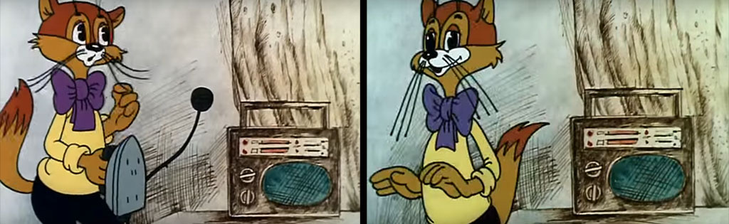 Итого мы имеем внезапно стершуюся надпись на автомате с газировкой во время погони под «Озверином» («Месть кота Леопольда») и розетку в именинной серии Леопольда, к которой присоединялся утюг.