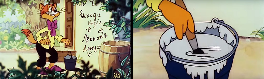 И еще ведро. Ведра в этом сериале несомненно обладают особой силой и собственным разумом. Самые скромные представители семейства ведер просто крутятся и немного передвигаются (эпизод «День рождения кота Леопольда, сцена с уборкой), а в вышеупомянутом моменте тара владеет способностью создавать в себе содержимое. Вот кот выходит с достаточно пустым на вид ведром, следующий же кадр — и в нем полным-полно краски.