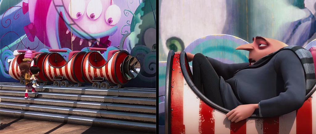 Помимо красочных пропаж, в обеих частях «Гадкого я» есть и внезапные, не поддающиеся логике появления. Отведите взгляд от милых рожиц на фото и посмотрите в левый нижний угол первого кадра: на столе никаких стаканов нет. Зато в следующей сцене за доли секунд стакан появляется, более того, сначала с прямой трубочкой, а потом с изгонутой. Этот рыжий парень явно не просто так на ярмарке работает. Ловкость рук налицо!